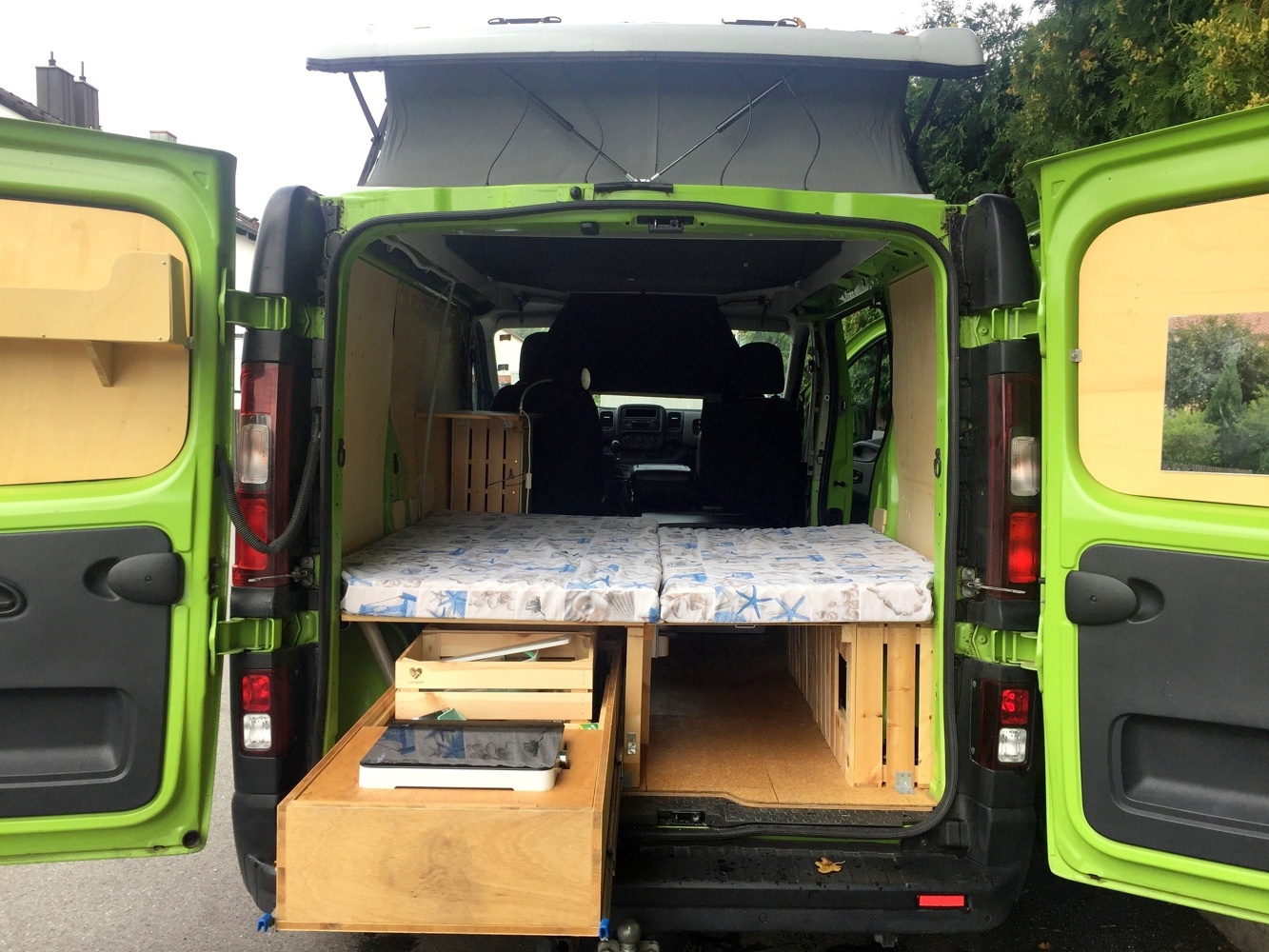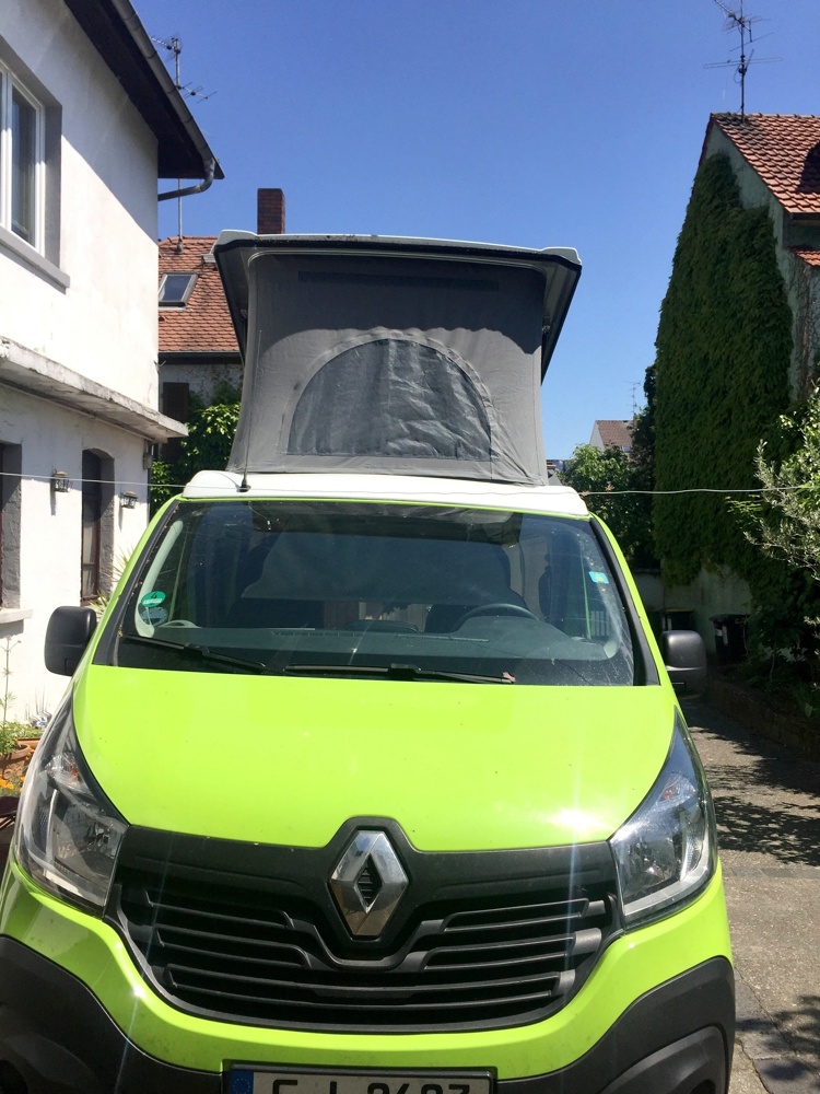 Situé au dessus du véhicule il se déplie par l'intérieur. Il permet de garder le confort d'un grand lit sans prendre de place dans le véhicule.