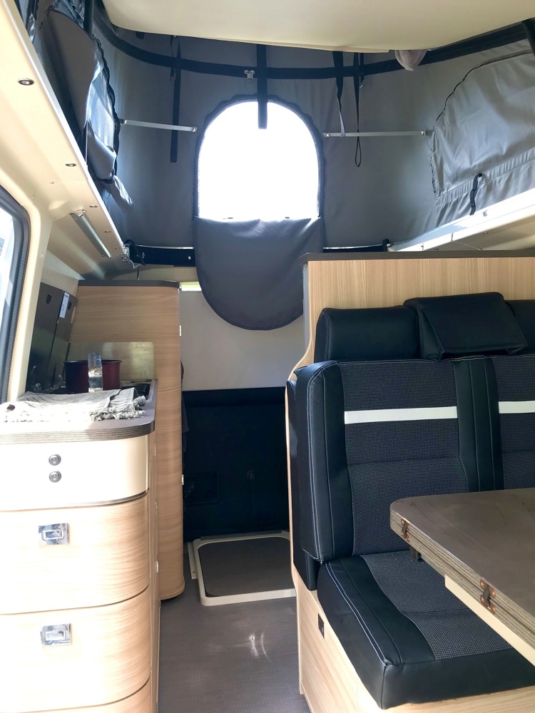 Situé au dessus du véhicule il se déplie par l'intérieur. Il permet de garder le confort d'un grand lit sans prendre de place dans le véhicule.