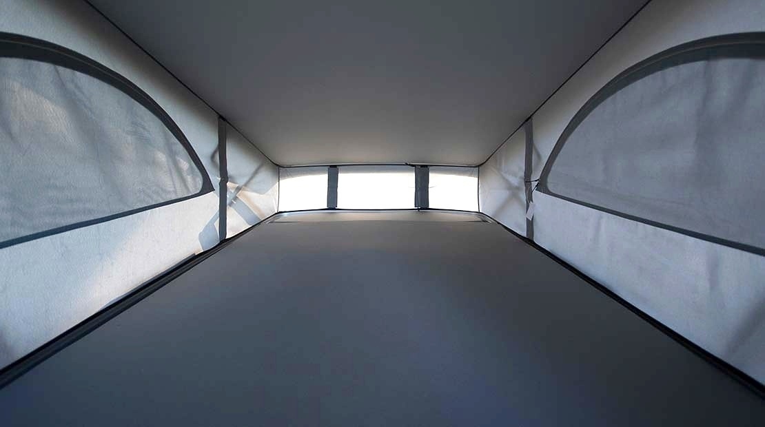 Situé au dessus du véhicule il se déplie par l'intérieur. Il permet de garder le confort d'un grand lit sans prendre de place dans le véhicule.