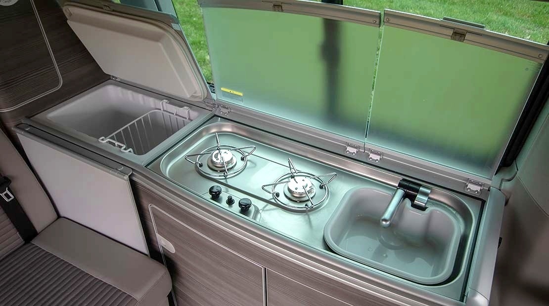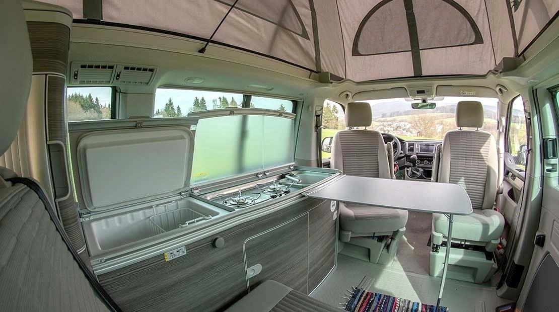 Le VW T6 California Ocean fait partie des vans aménagés haut de gamme de notre flotte. Si tu choisis de voyager avec notre « Surfer Suite » tu bénéficies d’un van 4 places comprenant entre autres les équipements suivants : une cuisine moderne (avec réfrigérateur, gazinière et évier), un toit relevable automatique, des sièges avant pivotants, une douche extérieure, une marquise - et bien évidemment une climatisation et un chauffage stationnaire pour affronter toutes les saisons !